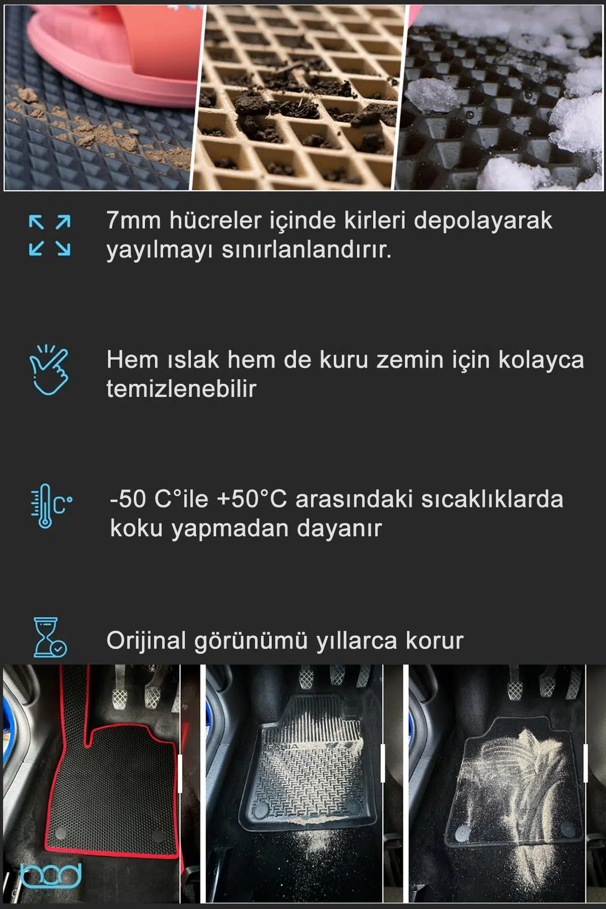 Hücreli Doku Teknolojisi: Özel 3D baklava tasarımı sayesinde ayakkabınızla gelen sıvı, çamur, kum ve tozu hapseder; aracınızın orijinal taban halısına geçmesini engeller.