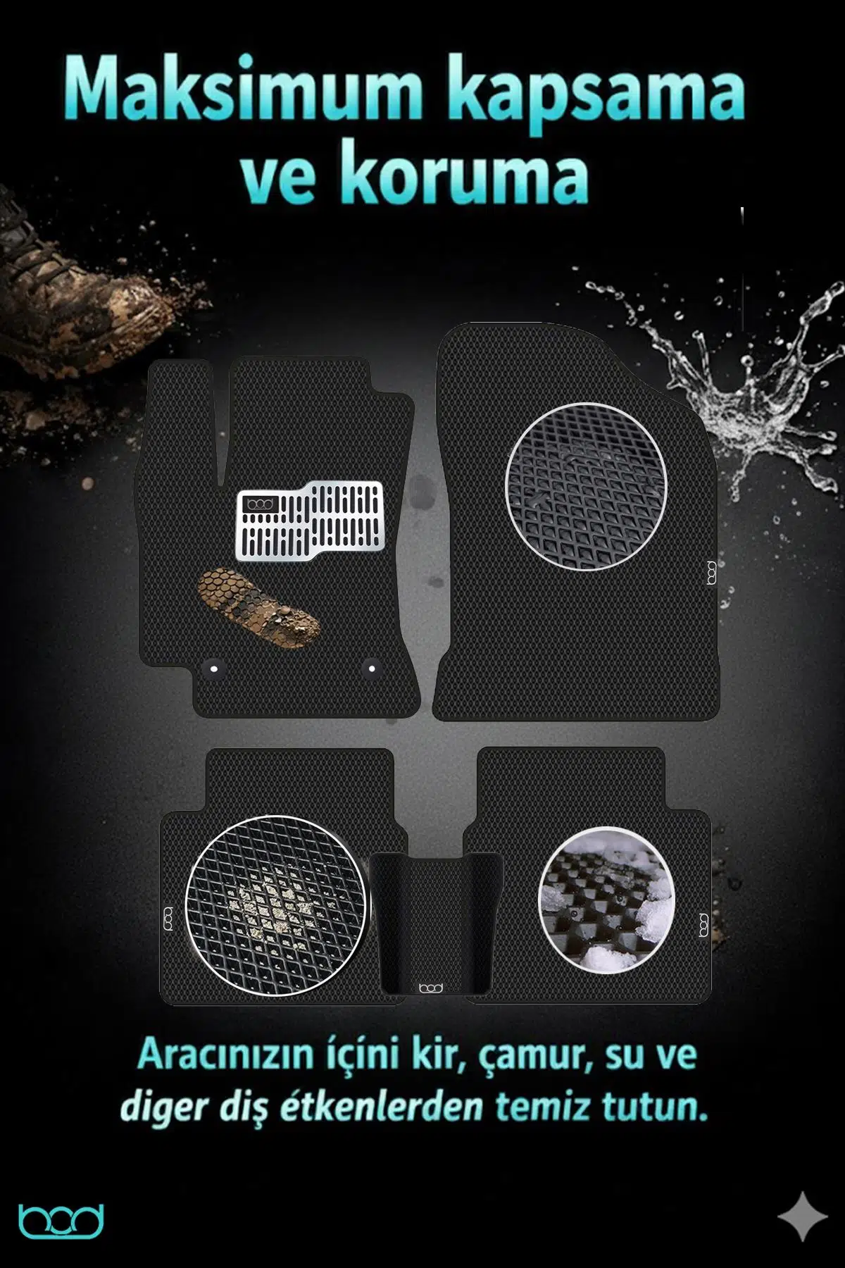 Hücreli Doku Teknolojisi: Özel 3D baklava tasarımı sayesinde ayakkabınızla gelen sıvı, çamur, kum ve tozu hapseder; aracınızın orijinal taban halısına geçmesini engeller.